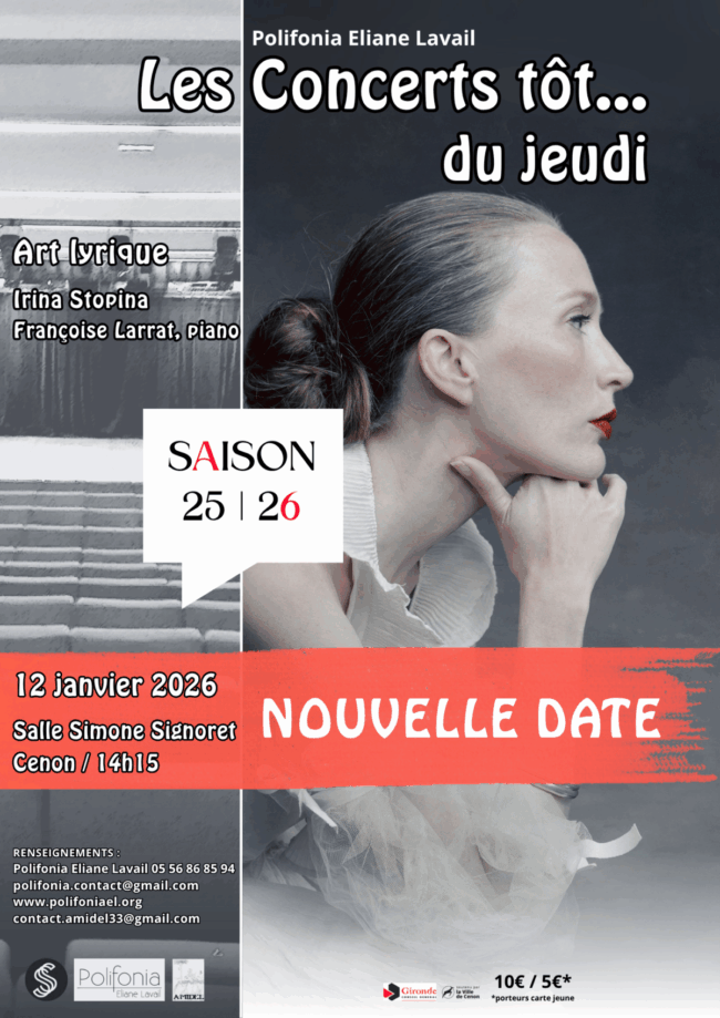 Nous avons le plaisir de vous informer que le Concert tôt… Art lyrique avec Irina Stopina, soprano et Françoise Larrat, piano est reporté au Lundi 12 janvier 2026 / 14h15 > Salle Simone Signoret, Cenon Les billets achetés pour la date initiale du 5 novembre 2025 sont valables pour cette nouvelle date. Programme :…
