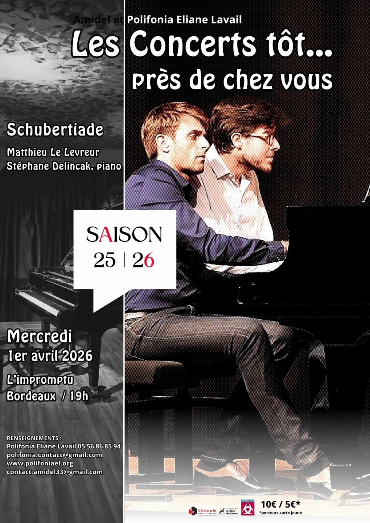 Programme : À deux ou quatre mains au clavier, ou en duo chant et piano, les deux complices nous transportent dans l’univers raffiné et envoûtant de Schubert. Du Divertissement à la hongroise tendrement mélancolique aux bouleversants chefs-d’œuvre des dernières années (Voyage d’hiver, Impromptus, Fantaisie en fa mineur), Stéphane Delincak et Matthieu Le Levreur ont réuni des pièces rarement présentées ensemble, faisant la part belle au lyrisme et à la mélodie.